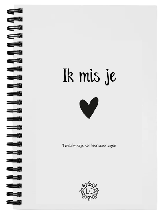 Later ontwikkelden we ook het Ik mis je invulboekje vol herinneringen. Een boekje met een gevarieerde inhoud waar we veel tijd en aandacht in hebben gestoken. Kinderen kunnen er hun gedachten, gevoelens en herinneringen in opschrijven, tekenen of bewaren, zonder goed of fout.